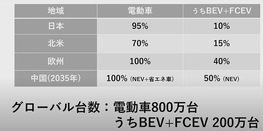 21年5月に開催した決算説明会において、同社は「50年もしくはそれより前に企業としてカーボンニュートラルを実現する」ことを改めて表明。具体的な目標の1つとして、30年にグローバルで800万台の電動車を販売する計画。そのうちEV・FCVの合計が200万台としている。地域別にみると、日本では電動車比率95%(うちBEV+FCV:10%)、北米では電動車比率70%(同:15%)、欧州では電動車比率100%(同:40%)、中国では35年に電動車比率100%(NEV+省エネ車)、そのうちNEVの比率50%を目指していく。