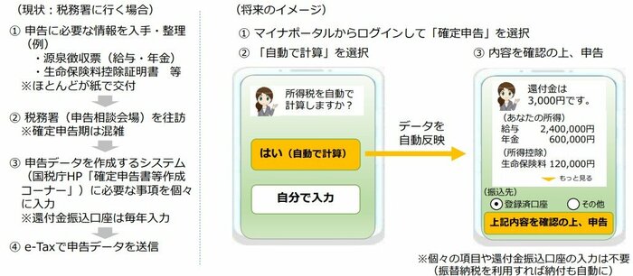 確定申告に必要なデータ(給与や年金の収入額、医療費の支払額など)を申告データに自動で取り込むことで、数回のクリック・タップで申告が完了する仕組みの実現を目指します。(下記イメージを参考。)