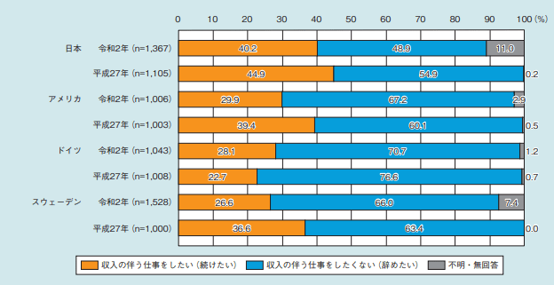 こうした中、「収入の伴う仕事をしたい(続けたい)」と回答している割合は、日本が40.2%と各国の中で最も高くなりました。コロナ禍においても、依然として日本の高齢者の就労意欲の高さが表れています。(下記グラフ参考)