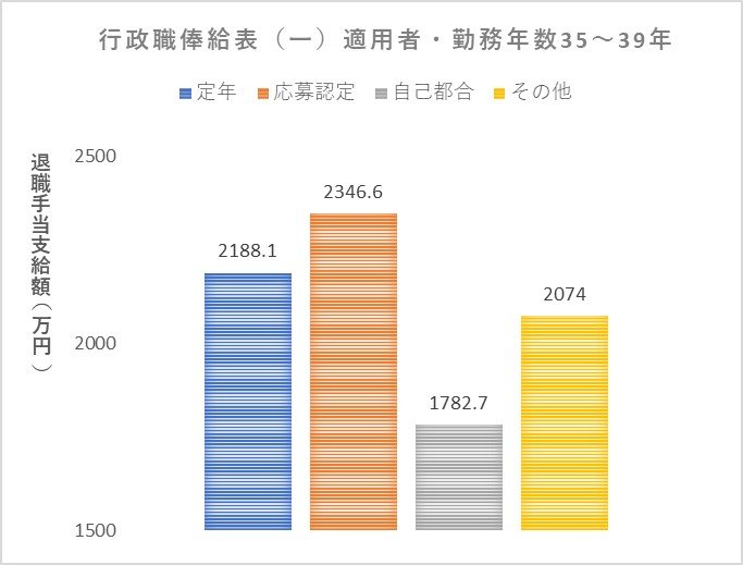 ここでは、一般行政事務職員等である行政職俸給表(一)適用者で、「35年以上勤務した場合の退職事由ごとの金額」を見ていきます。内閣人事局が公表する「退職手当の支給状況(令和元年度退職者)」からの抜粋です。