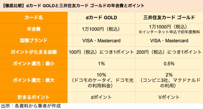 【徹底比較】dカード GOLDと三井住友カード ゴールドの年会費とポイント