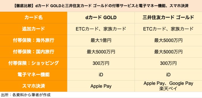【徹底比較】dカード GOLDと三井住友カード ゴールドの付帯サービスと電子マネー機能、スマホ決済