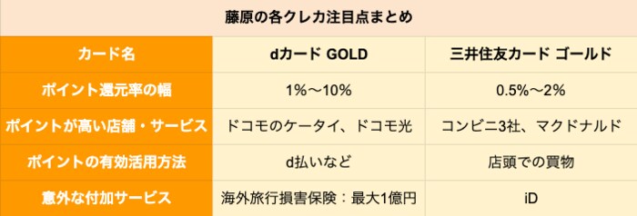 いかがでしたでしょうか。今回は「dカード GOLD」と「三井住友カード ゴールド」を比較しました。dカード GOLDはドコモケータイとドコモ光のユーザーであれば、その利用料金の10%がポイントとして毎月加算されるので、有効に活用できるでしょう。三井住友カード ゴールドはコンビニ3社とマクドナルドの利用が多い人にとってメリットがあると言えます。少しでもクレジットカード選びの参考になれば幸いです。