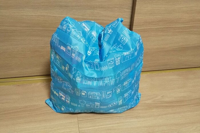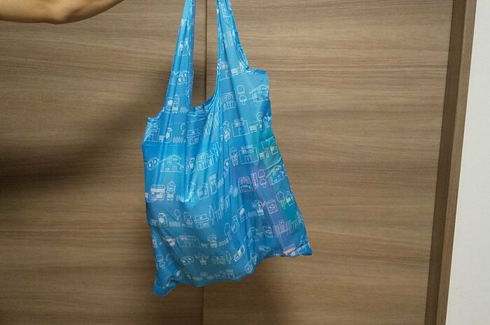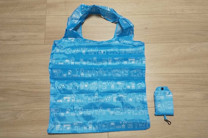 業務スーパーでは、日々のおつかいにピッタリなお買い物サイズのエコバッグを販売しています。今回ご紹介する「エコバッグ 折りたたみタイプ」は、40cm×40cmの普段のお買い物に使いやすいサイズです。かわいらしいイラストの描かれたさわやかなライトブルーが特徴のアイテムです。エコバッグを使用しない時は小さく折りたたんで収納袋に入れておけます。こちらの収納袋にはフックが付いているため、普段使用するバッグに掛けておくとエコバッグを忘れることも防げそう。