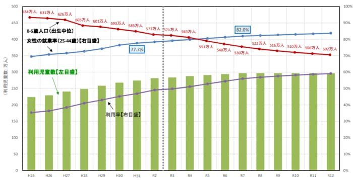なぜ2025年に利用児童数がピークを迎えるのか。端的に言うと、「女性就業率の上昇スピードよりも、少子化の速度が早いため」なのです。日本の少子化がいかに速いかを物語っています。