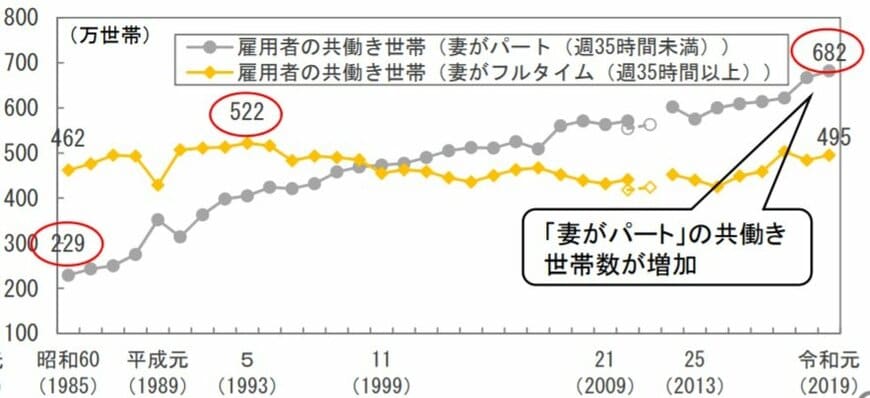 ただし、前出の「令和2年度版男女共同参画白書」で共働き世帯の内訳を見てみると、令和元年度(2019年)では「妻がパート(週35時間未満)」で働く世帯が682万世帯に対し「妻がフルタイム(週35時間以上)」で働く世帯は495万世帯(図表1参照)。