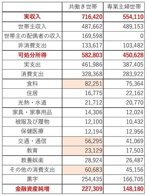 次に、共働き世帯と専業主婦世帯の月当たりの支出を見てみましょう。