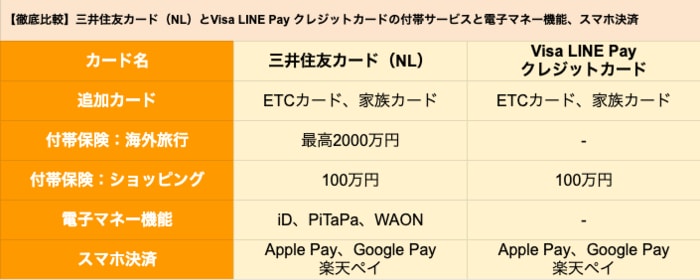 【徹底比較】三井住友カード(NL)とVisa LINE Pay クレジットカードの付帯サービスと電子マネー機能、スマホ決済