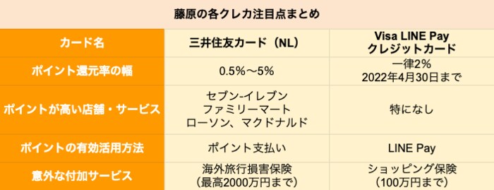 最後に、私の視点から今回ご紹介したクレジットカードの注目点をポイント還元率や有効活用方法、意外な付加サービスをまとめています。少しでもクレジットカード選びの参考になれば幸いです。