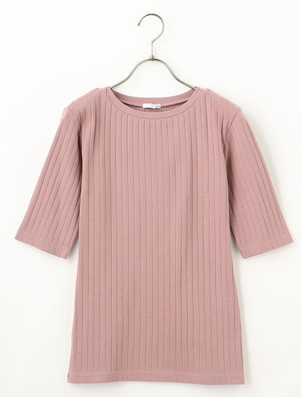 5分袖ですっきり見えが自慢のTシャツです。縦目のテレコ素材のすっきりシルエットと、気になる二の腕をカバーしてくれるやや長めの袖がポイントとなっています。シンプルデザインで幅広く使えるのも人気の理由です。