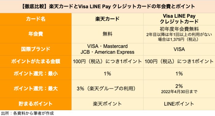 【徹底比較】楽天カードとVisa LINE Pay クレジットカードの年会費とポイント