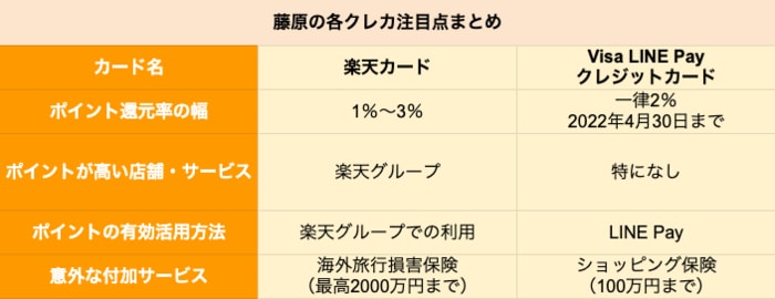 最後に、私の視点から今回ご紹介したクレジットカードの注目点をポイント還元率や有効活用方法、意外な付加サービスをまとめています。少しでもクレジットカード選びの参考になれば幸いです。