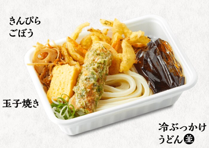 ちくわ磯辺天と野菜バラ天がトッピングされた2種の天ぷらうどんと、えび天がプラスされた3種の天ぷらうどん。どちらにもきんぴらごぼうと卵焼きが定番おかずとして入っています。できたてのうどんが家でも堪能できます。