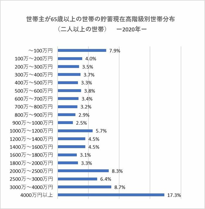 上のグラフによると、65歳以上世帯の40.7%が、2000万円以上の貯蓄を保有しているようです。その一方で貯蓄300万円未満の世帯も約15.4%存在しています。まさに二極化状態となっていることが分かります。