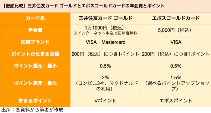「三井住友カード ゴールド」と「エポスゴールドカード」を比較