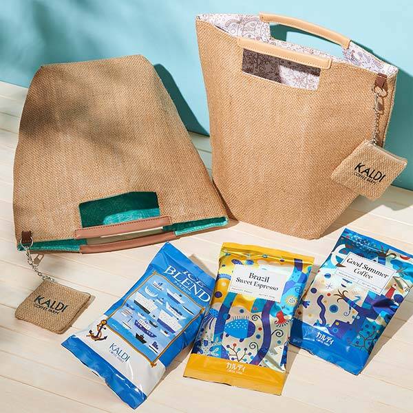 カルディの「夏のコーヒーバッグ」は、数量限定の3種類のコーヒーと夏にぴったりのジュート素材のバッグ、同素材のミニポーチ付で税込み1600円というお得なセットになっています。