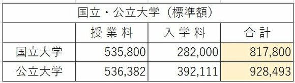 ただ実態は、ほぼすべての大学で標準額が適用されており、どの学部であっても基本的に授業料・入学金は変わりません。具体的には授業料は約53.5万円、入学料は約28万円です(図表2参照)。なお、公立大学は大学がある地域の住民かどうかで入学金に違いがある場合があります。