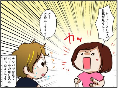 そして数日後。その話を友人兼ペットシッターのうっちゃん(99話参照)にしてみたところ、彼女は「それ、ナンパじゃなくて、バトルの申し込みだから~!」と断言。思ってもみなかった可能性に、祭さんは、「バトル⁈」と驚いてしまいます。