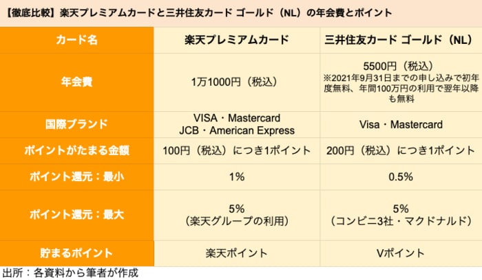 【徹底比較】楽天プレミアムカードと三井住友カード ゴールド(NL)の年会費とポイント