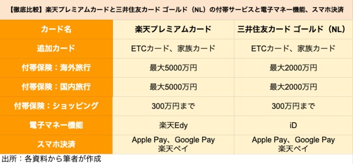 【徹底比較】楽天プレミアムカードと三井住友カード ゴールド(NL)の付帯サービスと電子マネー機能、スマホ決済
