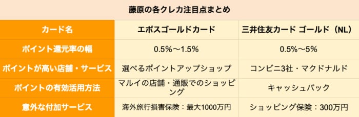 最後に、私の視点から今回ご紹介したクレジットカードの注目点をポイント還元率や有効活用方法、意外な付加サービスをまとめています。少しでもクレジットカード選びの参考になれば幸いです。