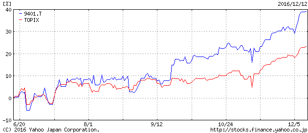 トランプラリーで日経平均やTOPIXが大きく上昇したという実感をお持ちの方は多いと思いますが、ご覧のようにTBS株は秋からこうした株価指数を大きく上回って推移しています。