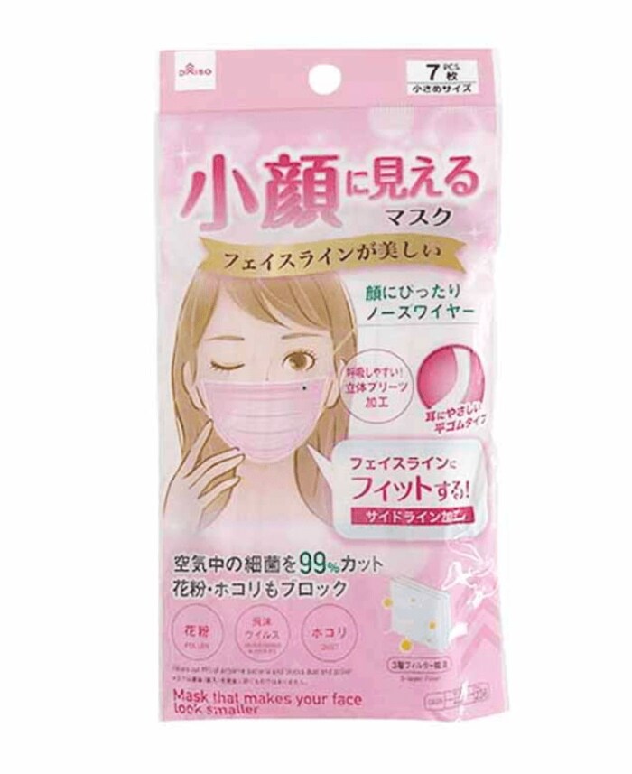 フェイスラインをスッキリ見せるサイドライン加工が施され、小顔を演出するマスク。3層フィルターで最近も99%カットします。
