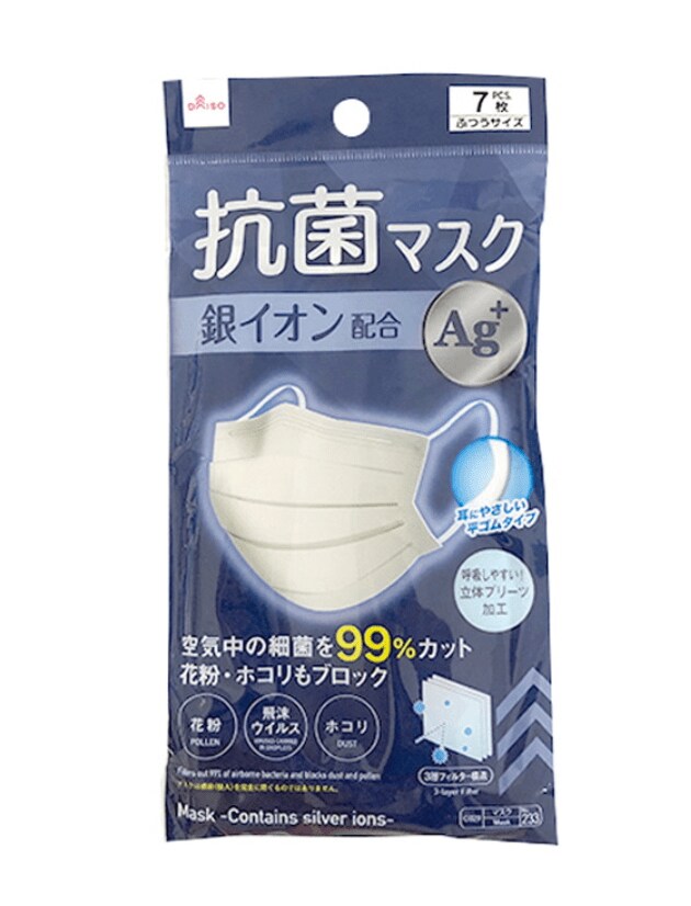 銀イオンが配合された抗菌タイプの3層フィルターマスク。耳に優しい平ゴムと、呼吸しやすい立体プリーツ加工です。