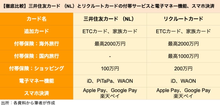 【徹底比較】三井住友カード (NL)とリクルートカードの付帯サービスと電子マネー機能、スマホ決済