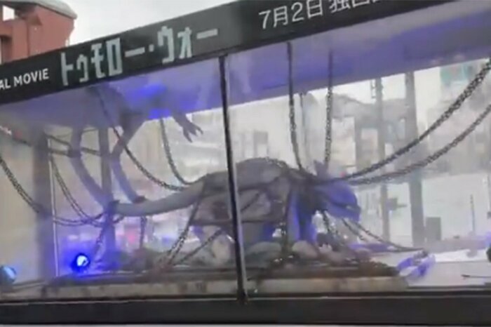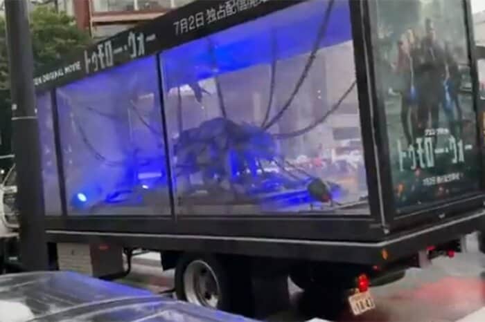 ツイートされていた動画を見てみますと、ガラス張りのトラックの中、鎖に繋がれ、口をパクパクさせながらあえいでいるエイリアンが…?「ギャー」と恐ろしい鳴き声も聞こえてきますね。