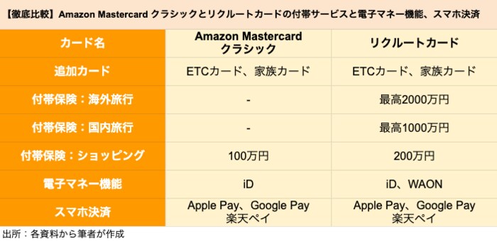 【徹底比較】Amazon Mastercard クラシックとリクルートカードの付帯サービスと電子マネー機能、スマホ決済