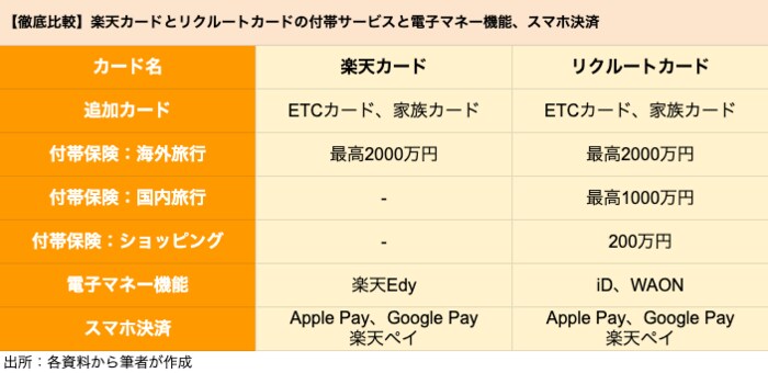 【徹底比較】楽天カードとリクルートカードの付帯サービスと電子マネー機能、スマホ決済