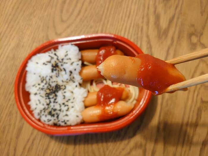 それと、隠れていて分かりづらいのですが、ウインナーの下に少量のパスタが敷いてあります。ちょっとしたお得感。