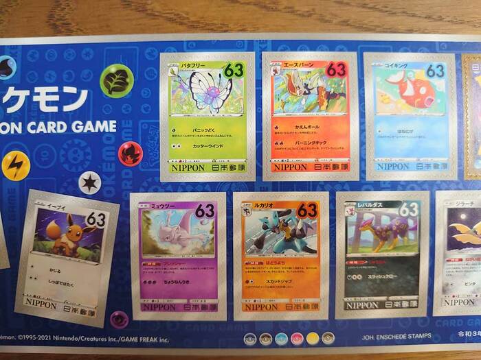 こちらはトレーディングカードゲーム『ポケモンカードゲーム』のカードデザインをそのまま切手にしてしまった意欲作。登場するポケモンはピカチュウ、イーブイ、エースバーン、バタフリー、ルカリオ、ミュウツー、レパルダス、コイキング、ジラーチの9種類。可愛らしくも勇ましいカードデザインが活かされた内容で、思わずこの切手でバトルしてしまいたくなります。
