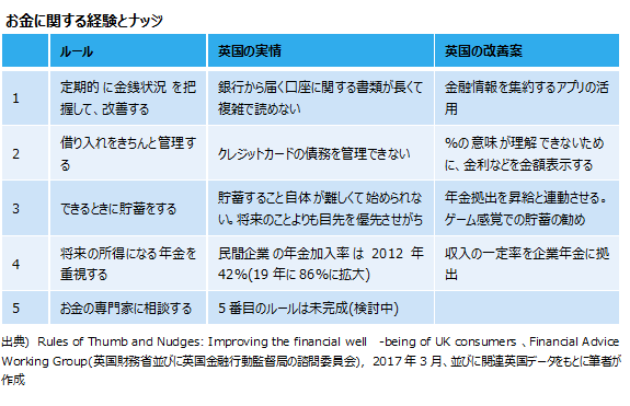 代わりに作った「お金に関する経験とナッジ」は5つにまとめられて、非常にシンプルな考え方です。表にまとめましたので、下記をご覧ください。