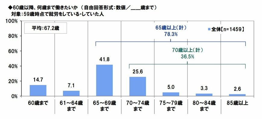 一方、60歳以降、何歳まで働きたいかと聞いたところ、平均は67.2歳。約8割は65歳以降も働きたいと回答しており、3人に1人は70歳以降も働きたいと考えているようです(図表1参照)。