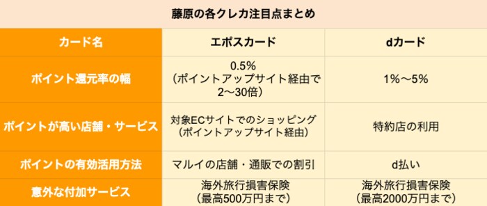 このように、エポスカードはマルイの利用者が多く、dカードはポイントの貯めやすさが喜ばれていることがわかります。