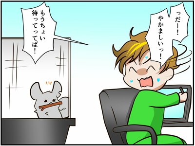 部屋中に高らかに響き渡る音に、だんだんと仕事に集中できなくなる祭さん。「っだー‼やかましいっ!もうちょい待ってば!(苦笑)」と思わす叫んでしまいます。
