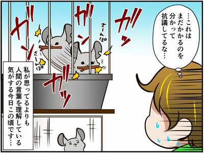 「おや?」という表情をして、一瞬動きを止めるおみくじちゃん。次の瞬間、持っていた小枝をくわえたかと思うと、勢いよくケージの中を走りはじめました。しかも、ケージの真ん中ではなく、ケージの端ギリギリを通り、くわえている小枝をケージの柵に打ち付けるという、なかなかにワイルドな走りっぷり。