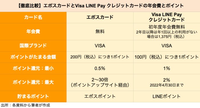【徹底比較】エポスカードとVisa LINE Pay クレジットカードの年会費とポイント