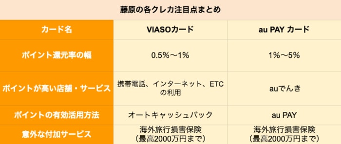 このように、VIASOカードは自動キャッシュバックが喜ばれており、au PAY カードはauでんきに加入している人が多いことがわかります。