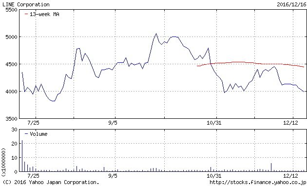 2016年の新規上場株の中でも特に話題をさらったのがLINE(3938)でした。そこで、LINEの株価の推移が最近どうなっているのかを見てみましょう。