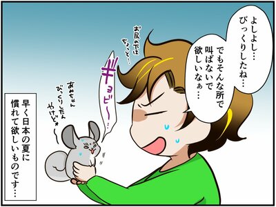 もともとアンデスの高地に生息する生き物であるチンチラは、日本のような高温多湿の環境では生きていくことが難しいとされています。昨年の夏に、祭さんの家(日本)で生まれたあみだちゃんも例外ではなく、初めての梅雨を迎え、暑さと湿気でぐったり気味。