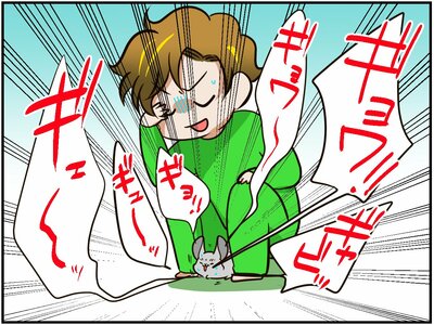 すると、そのタイミングで、ぴかっという光とともに、ドドーンという大きな音が!思わず「うわっ」と驚く祭さん。どうやら大きなカミナリが、近所に落ちてしまった模様。あわてて、あみだちゃんを見ると、これまたびっくりしたのか、床にうずくまってワナワナと震えています。