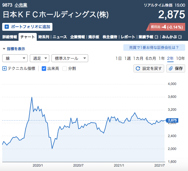 2019年6月まで2,000円台を横ばいで推移していた株価も、業績の伸びに伴い同年年末には3,000円を突破。その後コロナショックによって2020年3月には2,000円近辺まで落ち込みますが、デリバリー需要による売上好調が株価を牽引し、2021年7月現在は2,800円台を推移しています。