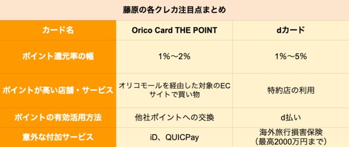 このように、Orico Card THE POINTは入会して半年間の還元率が、dカードはポイントの貯まりやすさや付帯サービスが喜ばれていることがわかります。