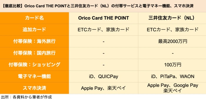 【徹底比較】Orico Card THE POINTと三井住友カード(NL)の付帯サービスと電子マネー機能、スマホ決済