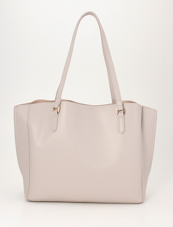 きちんと感がただよう、上品な印象のトートバッグです。A4サイズの書類がスムーズに入る大きさなので、通勤用としても大活躍します。こまかい荷物が収納できるポケットや、大容量のあおりポケットつきで整理も楽ちんなのだとか。取り外し可能なチャームがワンポイントになっています。