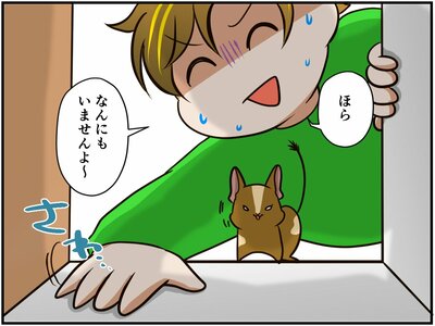祭さんは、「掃除するから遊んでてね~」と棟梁ちゃんをケージから出し、お掃除を開始。せっせせっせと片づけていると、背後で棟梁ちゃんが、家具の隙間に向かって「ヂェッ‼」「ヂュ~‼」とけたたましく声を上げ始めました。それは、動物が敵などに出会った時、仲間に危険を知らせるために鳴く「警戒鳴き」と呼ばれるもの。