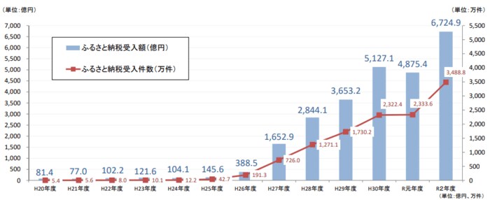 総務省は2021年7月30日、 ふるさと納税の受入額が約6725億円で、前年度から約1.4倍の増加となったことを公表しました。また受入件数は約3489万となり、約1.5倍増えています。